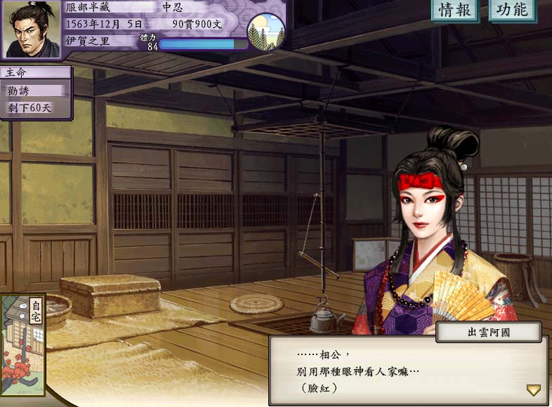 不過......老婆追回家後就沒啥用啦....回家時有人迎接的感覺是很不錯啦,但是沒啥特殊互動感啊!也不是把這當戀愛遊戲,但是帶回家後只有每個妻子通用的小事件,完全沒有娶了大美人阿國回家的殊榮感啦(死)